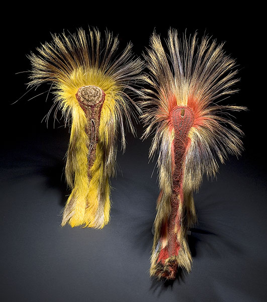 The Porcupine Hair Roach has been around for several centuries. As many ornamental wear had its place, the Porky Hair Roach was reserved for men who were warriors amongst almost all tribes. Before Porcupines were traded amongst all the people groups of the plains, plateau, prairie, lakes region, and woodlands, other hair was used. Turkey beard, horse hair, and even bear hair was used in the construction. Roaches were mounted on hair bases, mainly deer hair, which is a process of tying rows of deer hair together to form a base. Trimming this hair was done early on to achieve a neat effect. We see colors in the Porky Hair Roach fairly early as well. Every color that was being used to dye blankets, quills for quillwork, fabric, feathers, and other items was also used to dye deer hair for the construction of these roaches.
